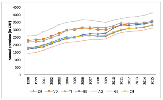 Average premium per canton, 1998–2015.