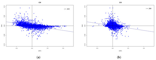 The relationship between DMS and explanatory variables. (a) RDPMi,t,c versus DMSi,t,c; (b) DRPCi,t,c versus DMSi,t,c.
