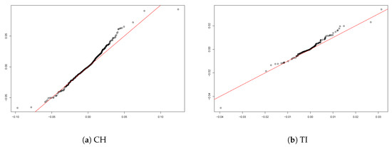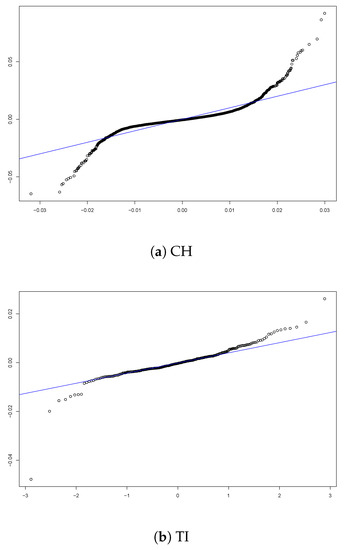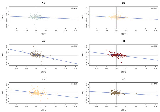 When we plot and versus for all Switzerland (Figure 9a,b), one can observe that the relationship is not linear. One possible explanation is that the plot mixes data points from all cantons and that the influence of the variables on the market shares differs in different cantons, in a superposition of different slopes. The value of the correlation coefficient between and is −0.420 and between and the value is −0.266 for the 6117 data points. Figure 10 presents the relationship between and for six selected cantons. Indeed, on the canton level the relationship turns out to be more linear, with the slopes differing across cantons. In fact, French cantons have a steeper slope than others, indicating stronger reactions by insureds in those regions. A similar picture occurs when plotting versus (Figure 11), with again more pronounced slopes for the French cantons.