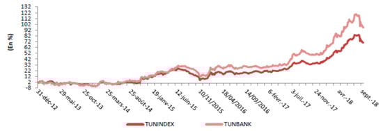 According to Hammami and Boubaker (2015), the banking sector is the lung of economic activity. This is the case of Tunisia, where the economy is a debt-based economy. Indeed, the equilibrium of the banking system is a health status barometer of the whole economy. Tunisian banks occupy a considerable place in the financial sphere, as seen by the strong synchronization of the evolution of the TUNINDEX index with that of the TUNBANK1, as shown in the following Figure 1.