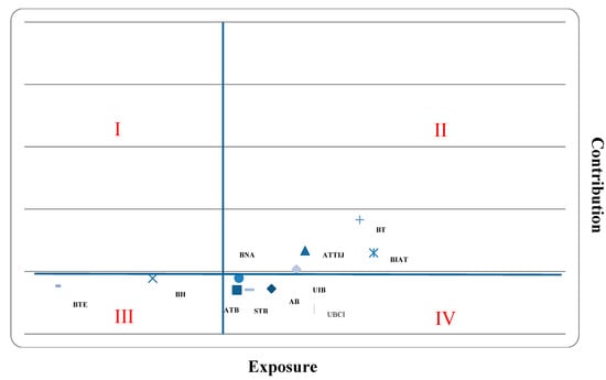 On the other hand, BIAT and BT exhibit, relatively, the smallest contribution and exposure measures as they are situated the most to the right and top; hence they are less concerned by systemic risk.