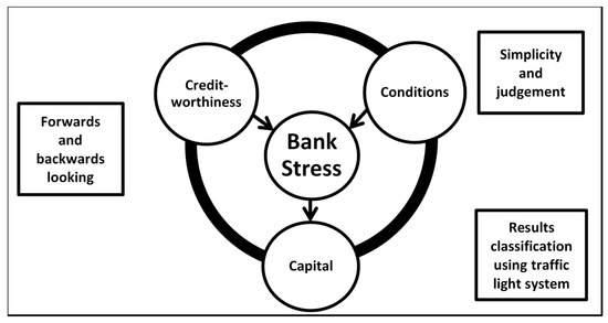 Forward and backward looking: The importance of looking forwards to future potential events in addition to backwards is highlighted by the Basel III regulations and by (Paraschiv et al. 2015; Li et al. 2018). Looking backwards involves an assessment of past factors causing banking distress, which provides guidance to potential future distress. Looking forwards involves a ‘what if’ approach which determines how well banks are placed to deal with future distressed Conditions and usually involves simulation of shocks to macroeconomic, internal, and market variables. In our model, this means looking to the past for guidance on how well banks are currently placed to withstand potential future shocks. Our model uses historical indicators (the variables from our 3Cs model mentioned below), to which we apply a distress factor (DF) as shown under the parameters and definitions in Section 4, to determine a bank’s resilience to a future distress scenario. Thus, as noted in Section 2, a key benefit of our model is that it is forward looking, whereas many indicators examined in that section are primarily backward looking.