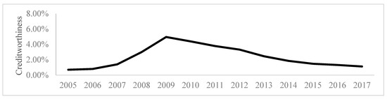 While the US Creditworthiness2017 risk is at relatively low historical levels (Figure 2), the US had low Creditworthiness risk (below 1%) just prior to the GFC, which spiked during the GFC (almost 5%), after which, financial sector reforms such as the Dodd–Frank Act were introduced, and Creditworthiness showed a reducing trend to 1.13% in 2017. The lines in Figure 2 plot the annual figure for Creditworthiness, which as defined in Section 4 is NPL to Gross Loans for U.S. banks as provided by the World Bank at an aggregated country level.