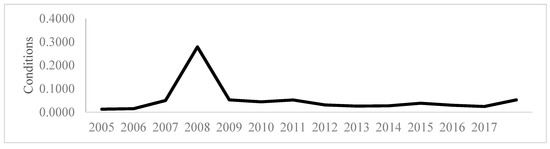 Our market-based metric is Conditions, measured by market asset value volatility. The US demonstrated a huge spike in the GFC as seen in Figure 3, where the lines in Figure 3 plot the annual Conditions.