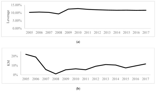 (a) Leverage Trend; (b) Market Value of Capital (KM) Trend.