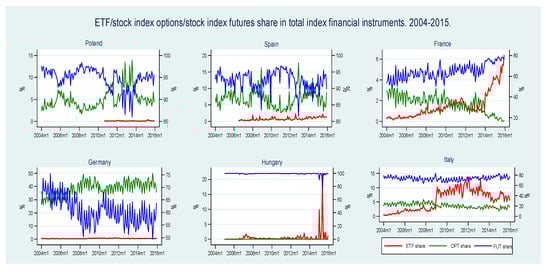 Summary statistics for exchange traded funds, stock index options, stock index futures and total index financial instruments. Monthly data for 2004–2015. For ETFs, the periods of analysis are: Poland, 2010m9–2015m12; Hungary, 2007m1–2015m12; Italy, 2004m1–2015m12; Spain, 2006m7–2015m12; Germany, 2004m1–2015m12; and France, 2004m1–2015m12. The number of ETFs varies across time periods and countries.