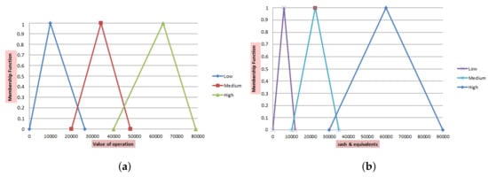 In addition to the value of the operation, we introduce, in our model, the following variables regarding the loan applicant’s financial situation: cash and equivalents, total income, total assets, total expenses, and total debts. These are not considered as numerical variables, but as linguistic ones. For example, the borrower’s income can be considered as “low”, “medium”, or “high”, with a degree of membership between 0 and 1. This assigned value, with its degree of membership was granted by the credit expert, according to the economic reality of Ecuador. For example, if low income is considered for the range of , the variable , would be defined as with a membership degree of 0.8.