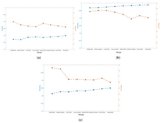 The performance of the methods SOM+PSO, SOM+varPSO, LVQ+PSO, and LVQ+varPSO, and their fuzzy versions SOM+Fuzzy PSO, SOM+Fuzzy varPSO, LVQ+Fuzzy PSO, and LVQ+Fuzzy varPSO, is detailed in
