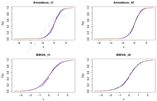 Figure 2, you see how our models (in red) adapted to the empirical cdf (blue) for the stocks of Amadeus and BBVA. As expected, the three-parameter model gave slightly better fits. In practice, the interesting thing to see is where improvements occurred, if any. The practitioner has to judge then what is of interest for his/her problem; ML cannot do this for him/her. However, ML can offer specification tests; see
