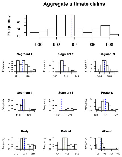 In Figure 1 we present histograms of the aggregate ultimate payments for the whole insurance portfolio, as well as for segments and different claim features (property versus bodily injury and Poland versus abroad). Such results can help the insurer to improve claims reserving as the insurer can now set claims reserves for policies grouped by claim features. Even at the portfolio level, we expect that the mean prediction from our models should be more precise than the Chain-Ladder estimate derived from aggregate data since our models are calibrated based on detail information about the claim development process, they can cope with seasonality and with changes in portfolio mix. In our case, the proportion of body claims in the portfolio decreases from in 2005 to in 2018, and the proportion of the claims caused abroad decreases from to . Since body claims and claims from abroad are expected to be the most severe, the Chain-Ladder estimates might be overestimated for the recent accident periods. Apart from calculating the best estimate of liabilities, the histograms in Figure 1 can also help the insurer to understand which claim features generate the most uncertainty of future payments. Such results can be used to calculate risk adjustments in IFRS 17 or define a safety buffer in claims reserves. We remark that there is a peak in the right tail of the histogram of the aggregate ultimate payments. We conclude that the portfolio is exposed to large claims, which mainly occur in late development periods from body claims and claims from abroad.
