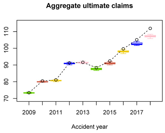 Boxplots of the aggregate ultimate payments from the RBNS claims (in MM). The dots indicate the Chain-Ladder estimates.