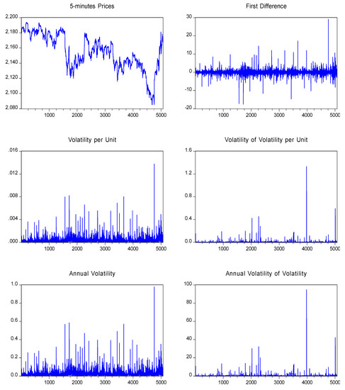 We used intraday prices for the S&P 500 equity index; the 1-min, 5-min and 30-min data cover the period from 11 August 2016 to 9 November 2016. This sample is strictly restricted by the availability of the intraday data available. We also used daily data for the same index ranging from 31 March 2015 to 31 November 2020. Data was retrieved from the Thomson Reuters database. The S&P 500 is the most common benchmark for the broader US equity markets, while it is one of the most heavily traded and liquid equity indexes. We employed intraday data due to the fact that they reveal important information not easily seen at lower sampling frequencies (e.g., daily data), such as the intraday changes and the market microstructures. Hence, volatility is more accurately estimated by employing high frequency data (see Hansen and Huang 2016; among others). We constructed the corresponding returns of each frequency, as the differences between prices at consecutive time points. Even though each frequency may be just enough to use for our estimators, there is an adequate balance between high and low sampling frequencies. For example, Liu et al. (2015) found that 5 min is an adequate sampling frequency for liquid assets, while 1 min was more appropriate for the diversified set of asset classes. Consequently, our empirical results of volatility and the volatility of volatility were compatible among different intraday frequencies. For our datasets, we applied the data-adjustment (cleaning) procedure suggested by Barndorff-Nielsen et al. (2009).3 Furthermore, we ignored trading days with recorded prices for less than 60% of the operating time’s expected observations and short trading days around major holidays.