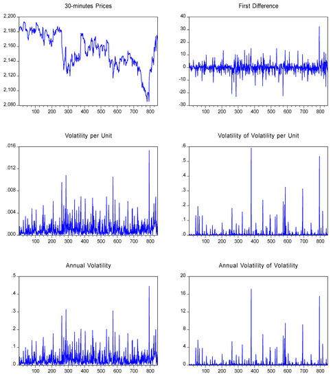We present the empirical results of volatility and the volatility of volatility for the S&P 500 equity index in Table 1, Table 2 and Table 3. An illustrated representation of our estimators is also given in Figure 1, Figure 2, Figure 3 and Figure 4 for each frequency under consideration. We present these figures in an Appendix. As we can see from the figures, there is clear evidence that not only the volatility varies over time, but also its volatility varies over time (mainly when considering lower frequencies i.e., 30-min returns or daily frequency). This also suggests that the stochastic volatility models proposed in the literature with constant volatility of volatility may fail to approximate the discrete-time short rate dynamics. Furthermore, we also see that the volatility of volatility behaves rather differently to the volatility itself. Such results are consistent with the views of Huang et al. (2019). Consistent with a setup of our model which separated volatility from its volatility, the correlation between volatility and its volatility was almost zero for the 1-min data, −0.0228 for the 5-min data and for the 30-min data was equal to −0.0671, while for the daily frequency it was equal to −0.0081. Although both measures have some common peaks, the overall picture is that large increases in volatility are relatively independent of the increases in the volatility of volatility.