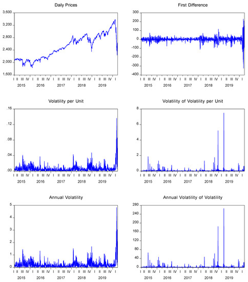 To evaluate the implications of the model for volatility and its volatility risks, we studied their predictability of the future market’s volatility expectations. To this end, we used the daily sample used in this study for the S&P 500 index (again from 31 March 2015 to 31 November 2020), along with the Volatility Index () and the Volatility of the Index ( of or ) for the same time period. We focused on daily data frequency due to the lack of availability of intraday data for the and indices. These indices were created by the Chicago Board Options Exchange (CBOE). The index (also called “Fear Gauge” or “Fear Index”) acts as a real-time market index capturing the market’s expectation of 30-day-forward-looking volatility. It is derived from the price inputs of the S&P 500 index options and provides a measure of market risk. As for the index, it can be considered as a measure of the volatility of the capturing the short-term volatility of the S&P 500 indices. It indicates how quickly market sentiment can change.