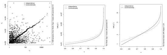 As the middle of Figure 1 shows, the dependence also affects . This example is chosen to be rather extreme, (perhaps) in (stark) contrast to intuition, under independence is even larger than under comonotonicity, for all α; this can also be shown analytically in this case in a rather tedious calculation; see (, Exercise 2.28).