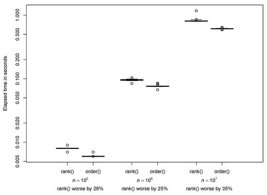 To see how much faster the nested call is than , we consider a small simulation study. For each of the two methods, we measure elapsed time in seconds when applied 20 times to samples of random numbers of different sizes.