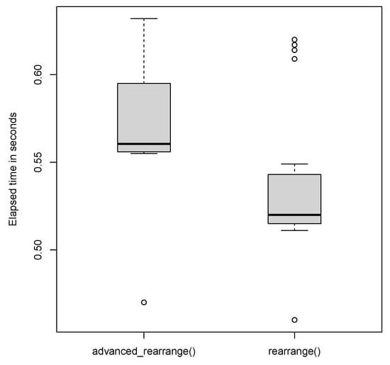 As we see from the box plot in Figure 5, on average, is slightly faster than . Although could even be made faster, it also computes and returns more information about the rearrangements than ; for example, the computed minimal row sums after each column rearrangement and the row of the final rearranged matrix corresponding to the minimal row sum in our case here. Given that this is a function applied by users who are not necessarily familiar with the rearrangement algorithm, it is more important to provide such information. Nevertheless, is still faster than on average.