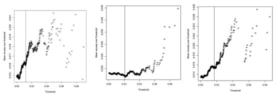 Mean excess plots for the negative log-returns of GOOGL (left), AAPL (middle) and MSFT (right) with chosen thresholds indicated by vertical lines.