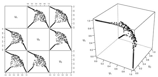Note that we did not utilize the stochastic representation , , for sampling . Instead, we sorted the realizations of so that their ranks are aligned with those of , in other words, so that the ith-smallest realization of lies next to the ith-smallest realizations of . The rows of this sample thus consist of , where denotes the ith order statistic of the n realizations of . Such a rearrangement mimics comonotonicity between the realizations of and . Note that this did not change the realizations of or individually, so it did not change the marginal realizations, only the joint ones.
