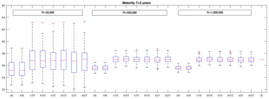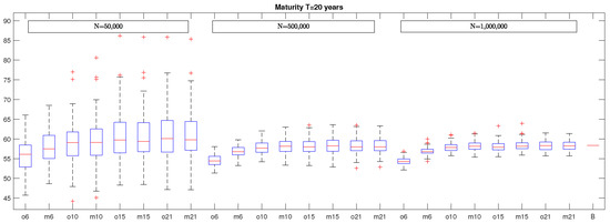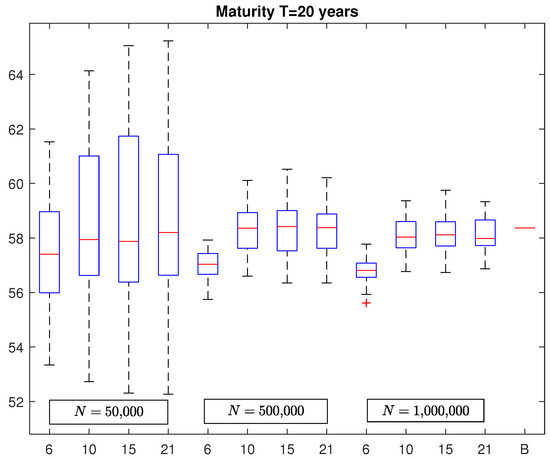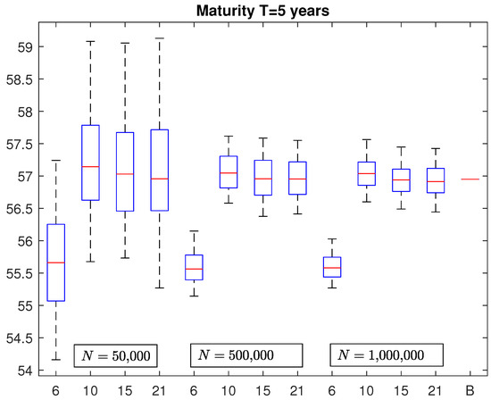 The simulations were conducted under the physical probability measure from the contract inception up to the risk horizon. After having obtained N couples , (), we associated with each couple a policy value computed by simulating, under the risk-neutral probability measure, paths of the risk factors from the risk horizon until the policy maturity, with the method of antithetic variates. The next step in the evaluation process is relative to the choice of the number and the type of basis functions needed to define the regression function. We considered at first an nth () degree polynomial function made up of a constant term plus all the possible monomials of order up to n that can be obtained from the two risk factors r and F. Hence, with , the regression function is made up of six terms ; with the regression function contains terms, i.e., ; and so on. For each value of n, we considered N = 50,000, 500,000, and 1,000,000 simulation runs. For the policy with maturity years, the corresponding results are illustrated in Figure 1. Each box plot contains 100 VaRs estimated with N = 50,000, 500,000, and 1,000,000 simulation runs, with and 21 basis functions, respectively. The last segment on the right, labeled B, represents the benchmark, equal to 56.9472. It has been obtained by averaging 100 VaRs, each one computed with N = 10,000,000 simulations by associating with each couple the closed-form formula of the policy value described in Equation (1), then ordering the values from the smallest to the greatest and taking the 9,950,000th-order statistic. The parameters of the stochastic processes describing the evolution of the risk factors were set equal to , , , , , , and , while and were set, for simplicity, equal to 0, but different values estimated on market data can be used and do not affect the precision of the evaluation model.