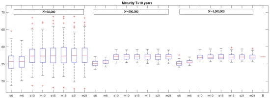 In Figure 2 and Figure 3, we report the box plots of VaR estimates in the case of a policy with maturity equal to and years, respectively. As before, the last segments represent the benchmarks which are equal to 57.1002 and 58.3666, respectively. By looking at these figures, it emerges a similar structure of the box plots already observed in the case of the five-year policy but with the obvious difference regarding to the variability of the VaR estimates that increases with the policy maturity. In fact, by considering again Table 1, we note that the MAPE increases to around and for N = 500,000 and N = 1,000,000, respectively, for the policy with maturity years and to and , for N = 500,000 and N = 1,000,000, respectively, for the policy with maturity years. In addition, in this case, we observe no significant change in VaR estimates by considering polynomial basis functions of degree greater than 3.