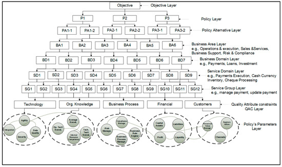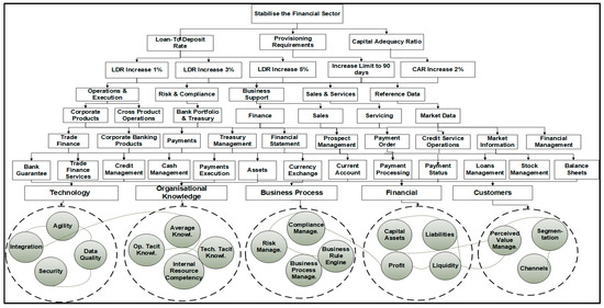 The following example illustrates the process of using the proposed framework. In Figure 3 we used a common task in every CB that stabilises the financial sector, as an objective. In the Policy Layer, we selected LDR, Provisioning Requirements and CAR as policy instruments. Then we assigned the policy alternatives that belong to each policy, as indicated in Figure 3. Then, each alternative was implemented through four departmental layers—Business Area, Business Domain, Service Domain and Service Group. These four layers are optional and designed to help decision-makers, regulators and staff to navigate where and how the processes are performed. The QACs, Technology, Organisational Knowledge, Business Process, Financial and Customers are classified and linked to the policy parameters that apply to their groups. Customer QAC is limited, in this example, to measure small and medium enterprise (SME) parameters. Once this policy alternative is executed by SAMA staff, it is sent to each bank to implement and return the results to SAMA. Each bank has the option to use the provided definitions and naming terminology or to use their own structure on the condition that they obtain the proper hierarchy path in each layer required to measure the policy alternative with its parameters.