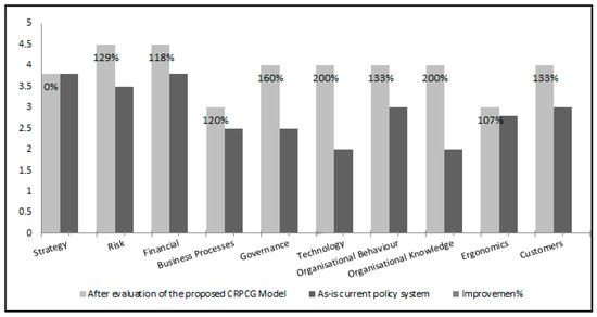 The evaluation of the presented CRPCG framework indicates a high chance of success in its implementation. Figure 4 shows the comparison of the two systems, wherein nine of the evaluated QACs scored more than a 100 per cent improvement. The focus-group workshop results revealed a 130% average improvement if the proposed framework is applied. Consequently, the study findings satisfactorily answered the research question on ‘how does the development of the CRPCG framework improve the return on policy and resolve information asymmetry and bounded rationality in CBs’ regulations?’
