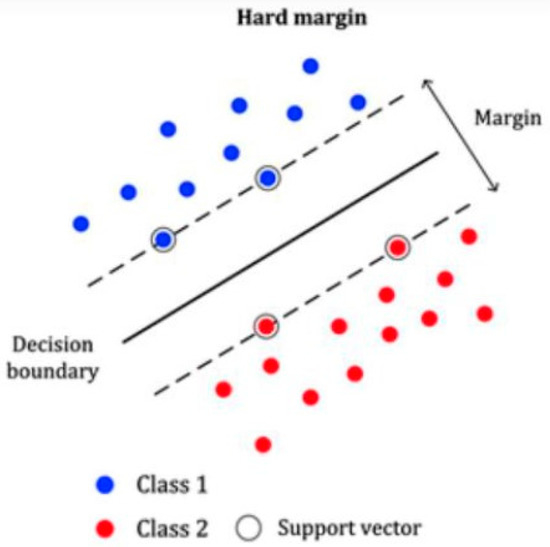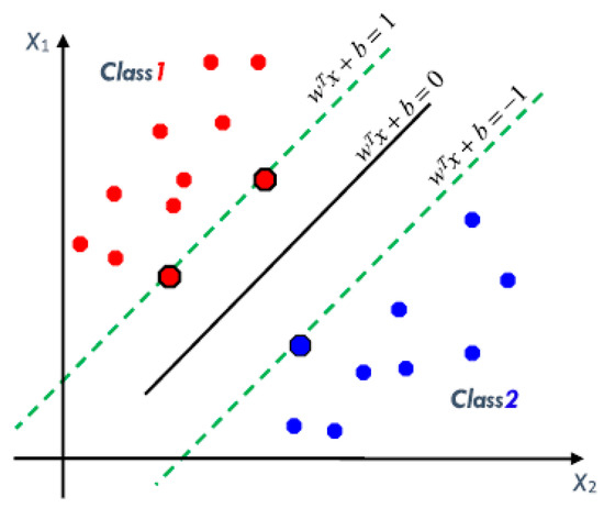 The hyperplane shown in Figure 1 separates data in two classes that must satisfy two conditions. First, the misclassification error should be at a minimum, and second, the distance of the linear hyperplane of the closest instance from each class should be at a maximum. Under the stated conditions, the instance of each class will be above or below the hyperplane. Two margins can, therefore, be defined as in Figure 2.