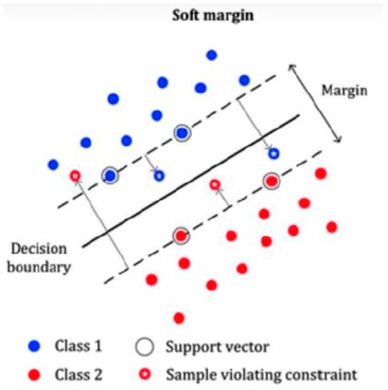 Here, “C” is the tradeoff parameter and is used to minimize the classification error and maximize the margin. We used the Karush–Kuhn–Tucker method to solve Equations (7) and (8) simultaneously. Let us consider that are the Lagrange multipliers. The unconstrained form of Equations (7) and (8) can be written as