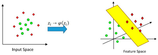 Figure 4 given below shows how the input data can be converted into a higher dimension by using kernel methods. The newly transformed coordinates show only the transformed data in a higher dimension. If is the input data, then the transformed data in the new feature space are represented by . The inner product of data in the new feature space is represented by a kernel function as in Figure 4.