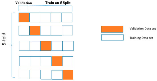K-fold cross-validation is a machine learning technique to check the stability and tune the parameters of the model. We divided the parent data into two parts in the proportions of 75% and 25% for training and testing data, respectively. We trained our model with training data and measured the accuracy of the testing data. In the case of K-Fold cross-validation, the input data were divided into “K” subsets, and we repeated this process “K” times. Out of k total subsets, one subset was used for the test set, and the remaining “K-1” subsets were used for training the methods. The algorithm error was calculated by taking the average of the error estimated during all “K” trials. By using this approach, we can eliminate the problem of overfitting. In this method, we used the 5-fold cross-validation technique, and the same is demonstrated in Figure 5.