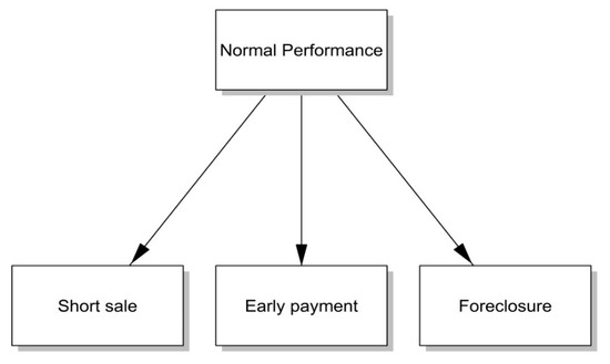 Competing risks generalise the standard survival analysis (Beyersmann et al. 2012) and refers to a situation where there is more than one cause of failure or outcomes (i.e., foreclosure, short sale or early payment). As such, competing risks models are meant to deal with situations where there is one initial state and multiple and mutually exclusive absorbing states (Deng et al. 1996; Stepanova and Thomas 2002). Among the competing risks, only the first one to occur is observed. Diagrammatically, a simple illustrative competing risks model is presented as follows (Figure 1).