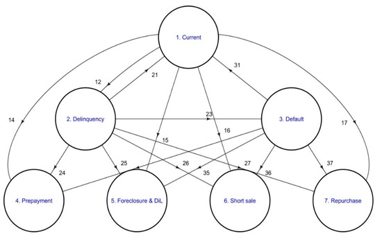A multi-state model framework for analysing mortgage loans data. Source: Author’s preparation. Notes: The numbers on the arrows represent the direction of the transition. For example, 12 represents the transition from State 1 (current) to State 2 (delinquency). Similarly, number 37 means transition from State 3 (default) to State 7 (foreclosure and Dil) and so on.