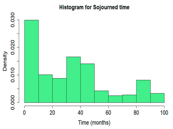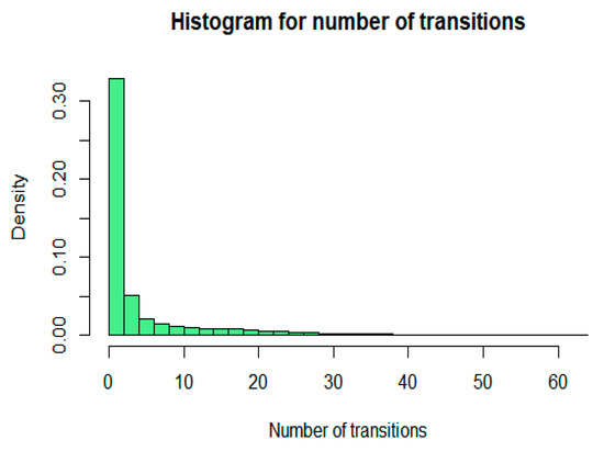 Figure 4 shows the distribution of the number of transitions experienced by borrowers. Only 11.6% of the borrowers had no transition at all, whilst about 54% transitioned (experienced event) only once, thus Figure 4 is skewed towards zero transitions. The direction or the states where the borrowers transitioned to are described in the transition matrix above (Table 6). Figure 5 shows the time spent in a state before experiencing an event or transitioning to another state. This ranged 1–92 months (Table 5). About 21% stayed in a state for three months or less before experiencing an event. On average, one stayed in a state for about 40 months (median sojourned time) before transiting into another state (Table 5). Further analysis shows that, on average, borrowers stayed in the “current” state for about 40 months before transitioning whilst they stayed about seven months in a default state before transitioning into an absorbing state (foreclosure, repurchase, short sale or prepaid).