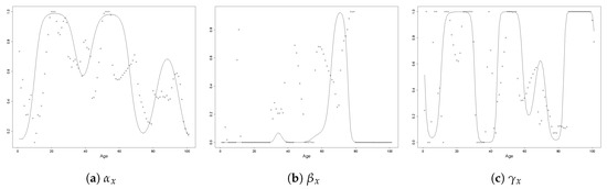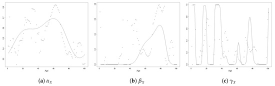 As argued in Li and Lu (2017), the fitted coefficients of all parameters should change smoothly for adjacent ages. To see this, for the smoothed Australian females and males mortality rates, we firstly fit an unpenalised 2-ETS model. The included ages are from 0 to 100, and the sample period is 1950–2006. The resulting , and are plotted in Figure 1 (for females) and Figure 2 (for males) as scatter dots.