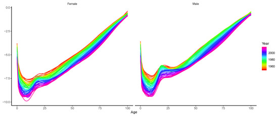 where is the average mortality level at each age, is the mortality index at time t, represents the age-specific sensitivity of to changes in , and is the error term with null mean. Since the right-hand side parameters are not observable, they are estimated by singular value decomposition (SVD) instead of the usual ordinary least square approach in the original paper.2 To avoid the identification problem, two constraints and are imposed. As implied by the first constraint, the age effect is set to the mean of log central death rates across years. Given the estimated and , is adjusted to match the fitted total number of deaths to the observed values in each year t. The reconciliation rebalances the equal contribution by mortality at all ages by assigning greater weights to ages at which death counts are larger.