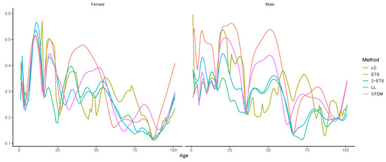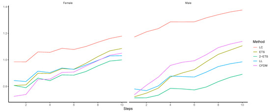 Figure 4 plots the against age. A summary of RMSE values computed across ages is presented in Table 1. As indicated, the LC model tends to produce the least accuracy at most ages for both genders, whereas no single model uniformly beats the rest. More specifically, all the models except 2-ETS show some peaks (abnormally large RMSE values) at age groups of around 20 for female population, and the forecast error at around age 12 under all the five candidates present a significant peak. For males, besides the unusually large at age 20, LC and CFDM exhibit a peak at age 60. In general, the two single-population models and CFDM tend to produce large RMSEs at certain ages. The curves of LL and 2-ETS show similar shapes, whereas our 2-ETS model clearly outperforms all the other competing models over ages 15–30.