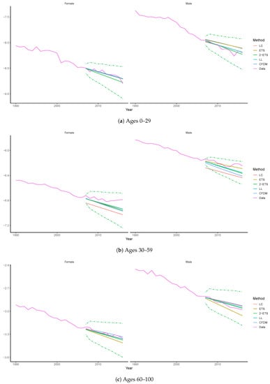 Figure 7 plots the observed and predicted values of log mortality rates averaged over different age groups. The green solid line refers to the point forecasts under the 2-ETS model. The associated 95% PIs obtained via simulations are presented as dashed lines. It can been seen that over 2007–2016, the observed values consistently fall within those PIs for both females and males. Nevertheless, the projections under the five models are not far away from one another, except for the middle age group under the LC model.