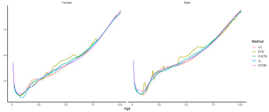 We have collected mortality data of Australian female and male populations aged 0–100 between 1950 and 2016 from the Human Mortality Database (2020). The starting year is chosen as that investigated in Booth et al. (2006) and Hyndman et al. (2012) to obtain a complete and relevant dataset. Figure 3 displays the age-specific log death rates over the sample period. It can be seen that Australian Females and males both exhibit continual mortality improvements, while some distinctions exist. For example, the decrease of male death rates at around age 20 (accident hump) has been more rapid than that for females in recent years. Multi-population models may be able to capture those similarities and differences between the two populations. We compare the forecasting performance between the LC, ETS, 2-ETS, LL, and CFDM models using the 10-step-ahead projection, with a training set of 1950–2006. Then, the predictions are compared against observed (true) values to assess forecast accuracy. Female and male data are modelled separately (jointly) under the single-population (multi-population) models.