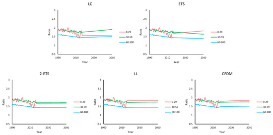 Following Li (2013), we examine the coherence of mortality forecasts between sexes by plotting the male-to-female ratios from 1990 to 2050. The observed (predicted) mortality rates are averaged over each of the three age groups: 0–29, 30–59, and 60–100, then the mean values of the male population are divided by those of the female population to obtain the corresponding ratios. As indicated in Figure 9, the three multi-population models produce convergent ratios in the long run for all age intervals, which is not the case when single-population models are applied. For instance, the male-to-female ratios of the youngest group under the LC model and the middle age group under the ETS model show a decreasing trend, which potentially causes the crossover problem of mortality forecasts between genders.