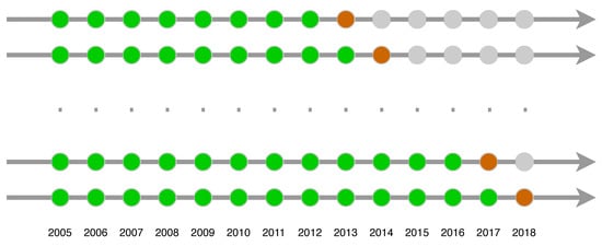 All the models are estimated using six expanding windows, each starting from 2005, and at least composed of 8 years (until 2012). The structure of the resulting procedure is depicted in Figure 3, where the sequence of green circles represents the learning sample and the brown circles the testing (or out-of-sample) periods. Globally, the out-of-sample time span is the period 2013–2018, for a total of 9818 matches. It is worth noting that the final ANN models for each testing year will have a unique set of optimal weights and may also retrieve a different number of nodes belonging to the hidden layer. The ANN models selected by the validation procedure, as illustrated above, have a number of nodes in the hidden layer varying from 5 to 30.