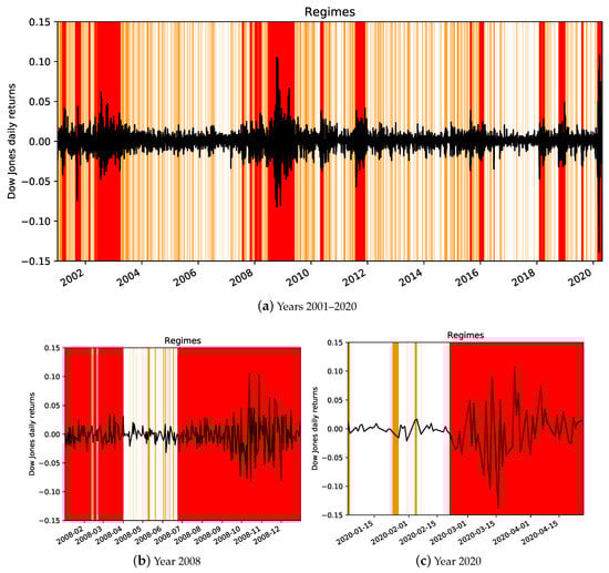 Time-series plots for the Dow Jones Industrial Average index returns and different regimes based on smoothed probabilities for the periods: 2001–2020 (Panel a), 2008 (Panel b), and 2020 (Panel c). In all panels, the white, orange, and red colors identify the tranquil, volatile, and turbulent regimes, respectively.
