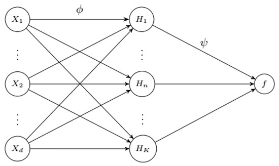 - Starting with the connection between the input layer and the hidden layer, let represent an input node and the node from the hidden layer, then each hidden node is obtained as:where is the number of input variables, is the weight of the input layer i with respect to the hidden node k, is the bias node, and is an activation function.