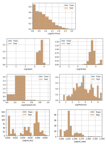 Using Kolmogorov–Smirnov tests, one can check if the distributions of the test and training sets are similar, feature-by-feature. Here, with the random sample selection, there was an assurance of similar distributions, as confirmed in Table 4 and Figure 6. If we were to use our NN models in other samples, checking that the training set used to train a particular NN model and the test set we wanted to apply the model to were in fact representative of the same reality seemed good practice.