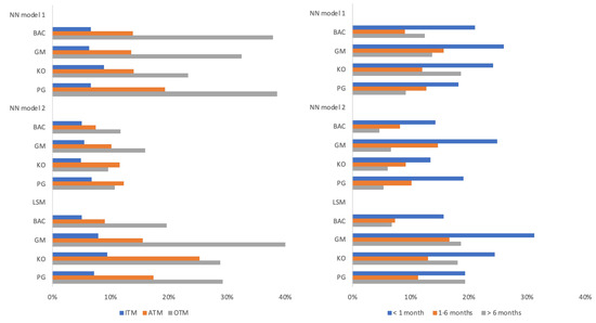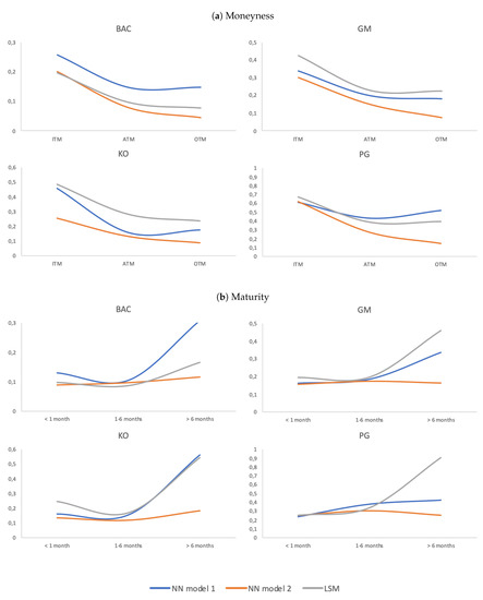 Table 7 presents results per company and for different moneyness and maturity. Figure 10 illustrates the same results. Since these were absolute results, i.e., values in USD ($), naturally, the most expensive ITM options tended to present higher deviations than ATM or OTM options. See Figure 10a. This bias—or “smirk”—is present on the graphs of the four companies. More importantly, at all instances, our NN Model 2 (orange line) had the lowest errors. When comparing our naive NN Model 1 (blue line) and LSM (grey line), the evidence was mixed. For the underlyings GM and KO, our NN Model did better than LSM, no matter the moneyness class. When BAC stock was the underlying, LSM showed less errors than NN Model 1, with error levels above, but close to NN Model 2. Finally, for the PG stock, LSM and NN Model 1 showed very close results to one another, with NN Model 1 performing slightly better for ITM options and LSM slightly better for ATM and OTM options.