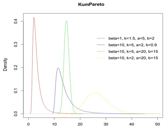 where . In the following Figure 2 we report the KumPareto density function varying the parameters: