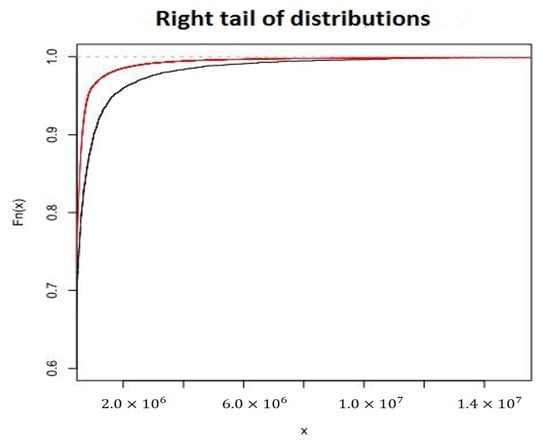 Right tails of Lognormal–KumPareto (red line) and empirical distribution (dark line) functions.