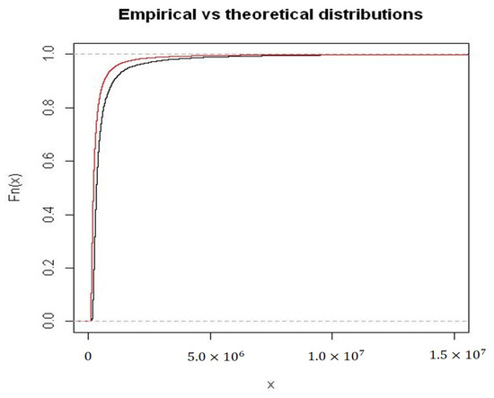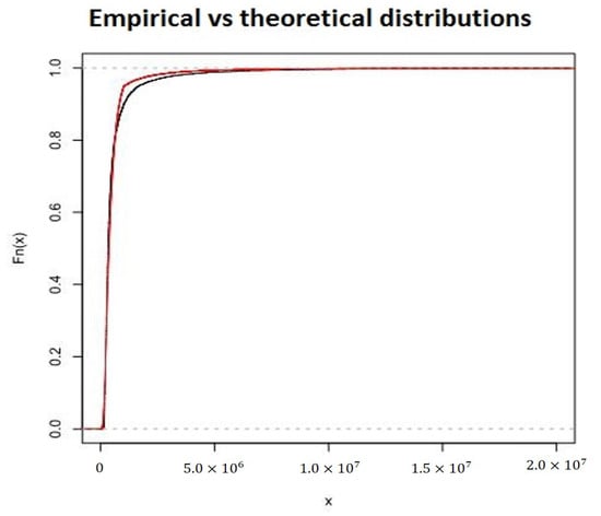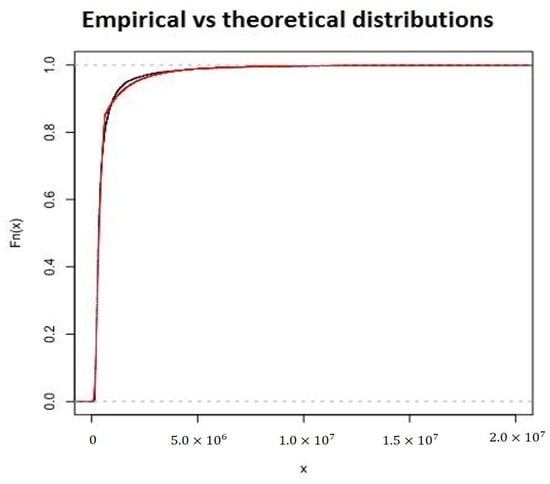 Lognormal–Burr and empirical distribution functions (red and dark lines).