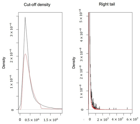 Left, comparison between cut-off density functions. Right, empirical and theoretical (red) right tail.