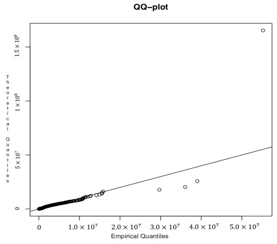 We go forward modeling a Lognormal–Generalized Pareto Distribution (GPD), that is we choose and and then we generate pseudo-random numbers from quantile function (10). In Table 6 and Figure 5 we report the estimates of parameters, 99% confidence intervals and the QQ plot ( and are the Lognormal parameters, while and are GPD parameters):